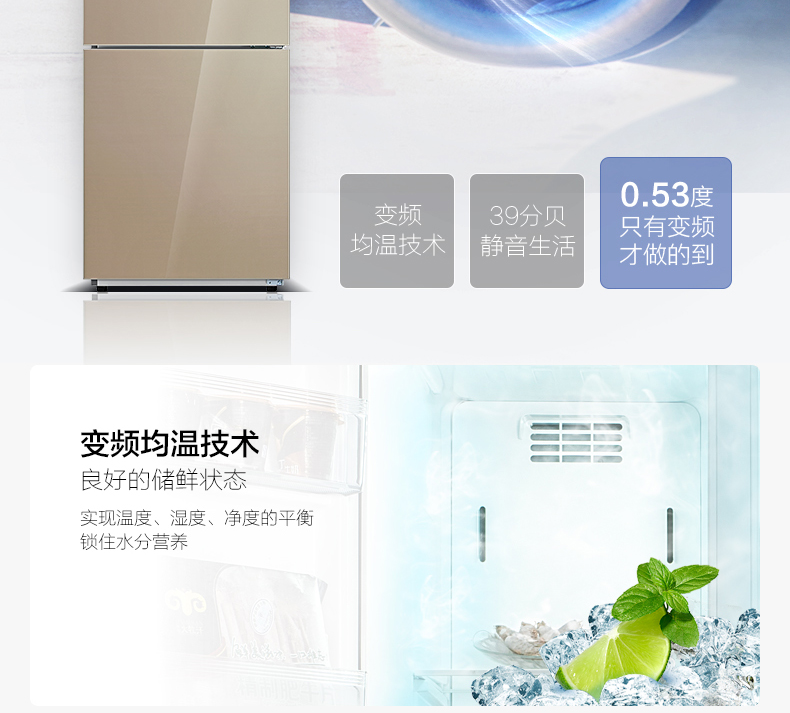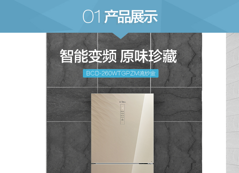 美的(Midea) BCD-260WTGPZ 260升风冷无霜变频玻璃面板冰箱(流纱金)