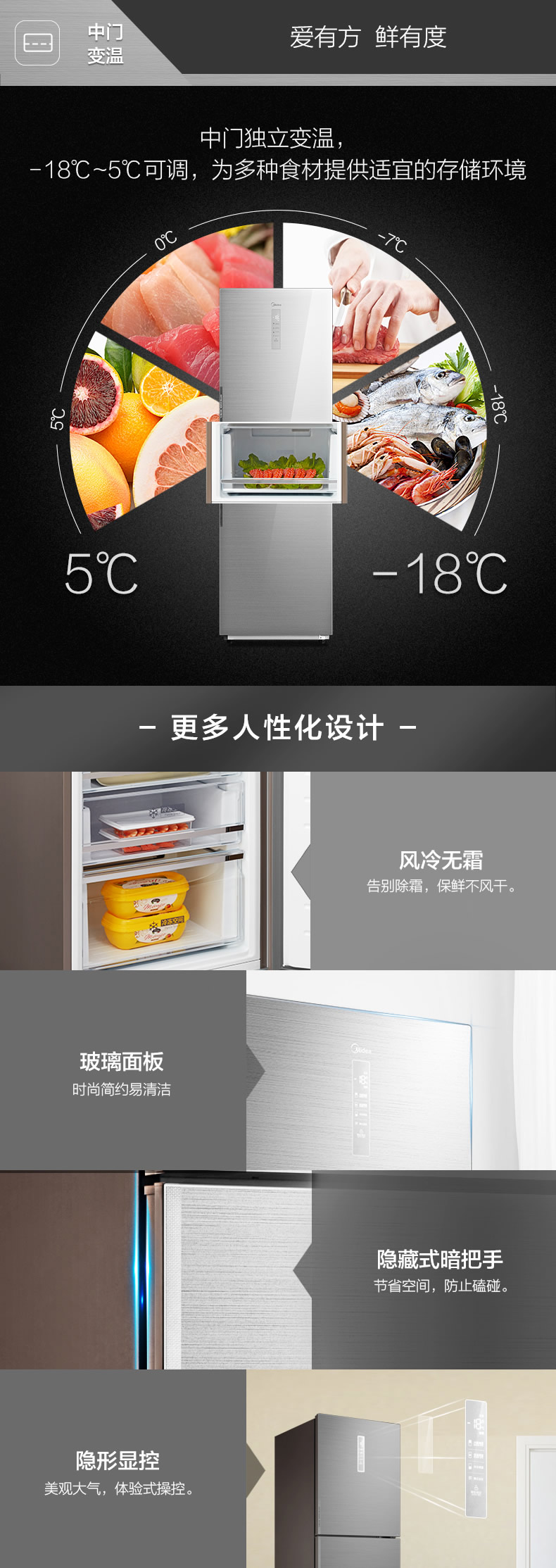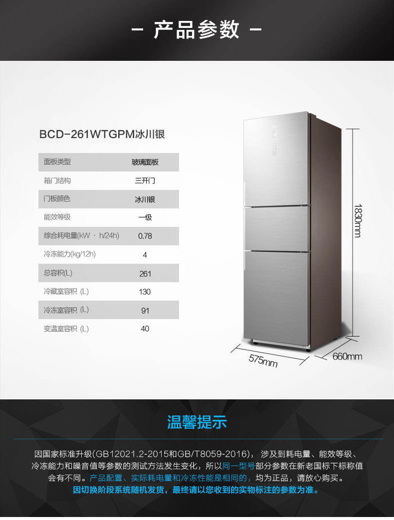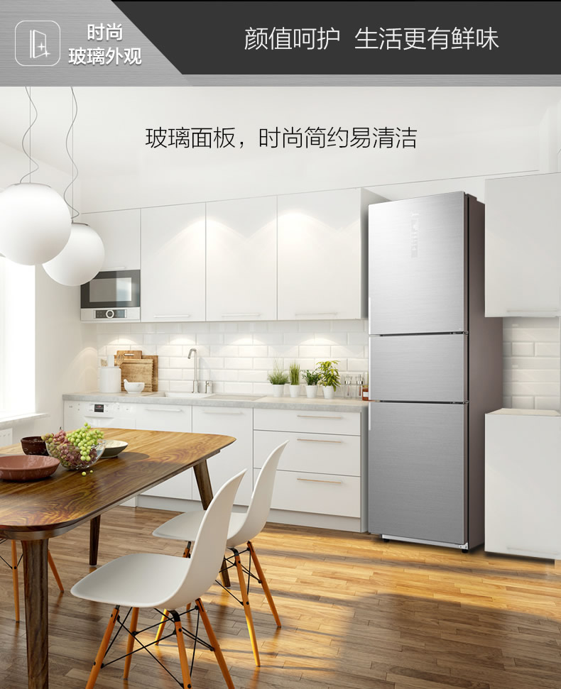 美的(Midea)冰箱261升BCD-261WTGPM风冷无霜三门冰箱智能变频静音 261升冰川银