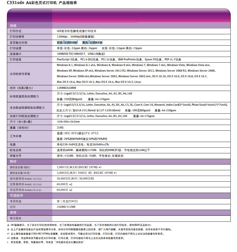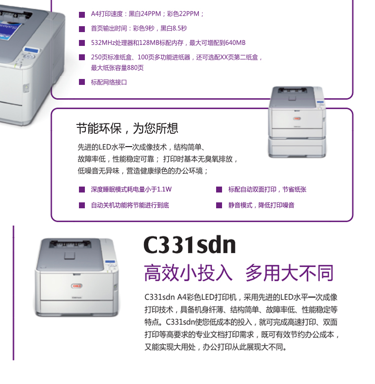 OKI C331SDN A4彩色激光打印机 自动双面